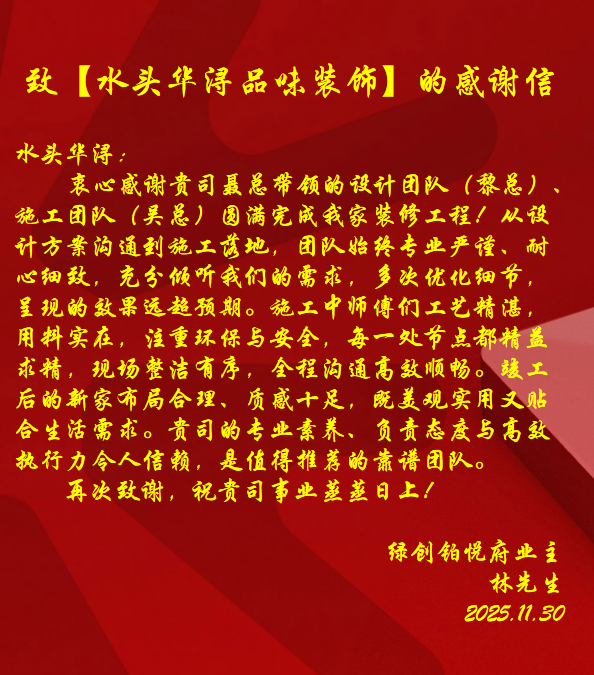 十一月,是收獲的季節(jié),也是新的起點(diǎn)。感謝所有客戶的信任與支持,是你們的肯定讓華潯在追求卓越的道路上更加堅(jiān)定。十二月已至,華潯品味裝飾將繼續(xù)以匠心守護(hù)初心,用專業(yè)與熱情為更多家庭打造夢(mèng)想中的家。